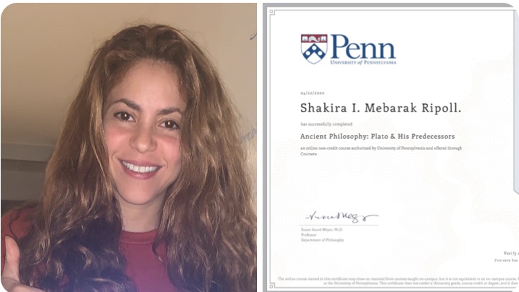 La cantante Shakira compartió en sus redes sociales, su diploma de un curso de filosofía antigua que hizo durante la cuarentena en la Universidad de Pennsylvania.