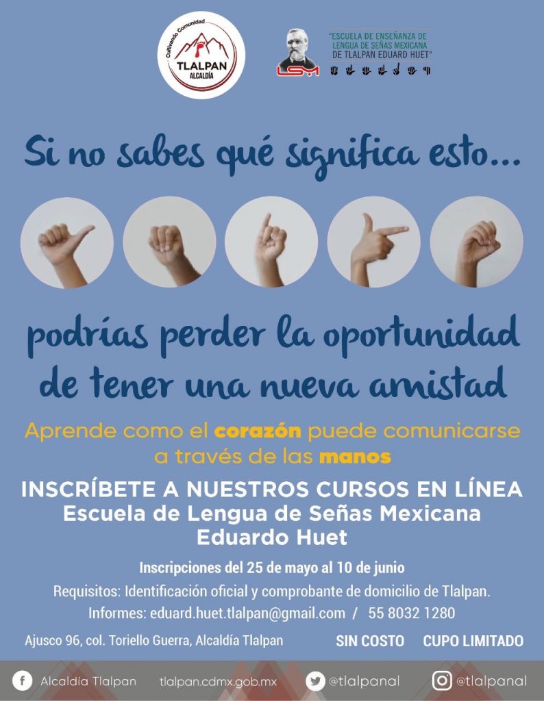 Ante la emergencia sanitaria por COVID-19, la Alcaldía Tlalpan ofrecerá cursos de Lengua de Señas Mexicana mediante clases en línea de forma gratuita. Esta actividad tiene el objetivo de fomentar la inclusión de grupos prioritarios en la demarcación.