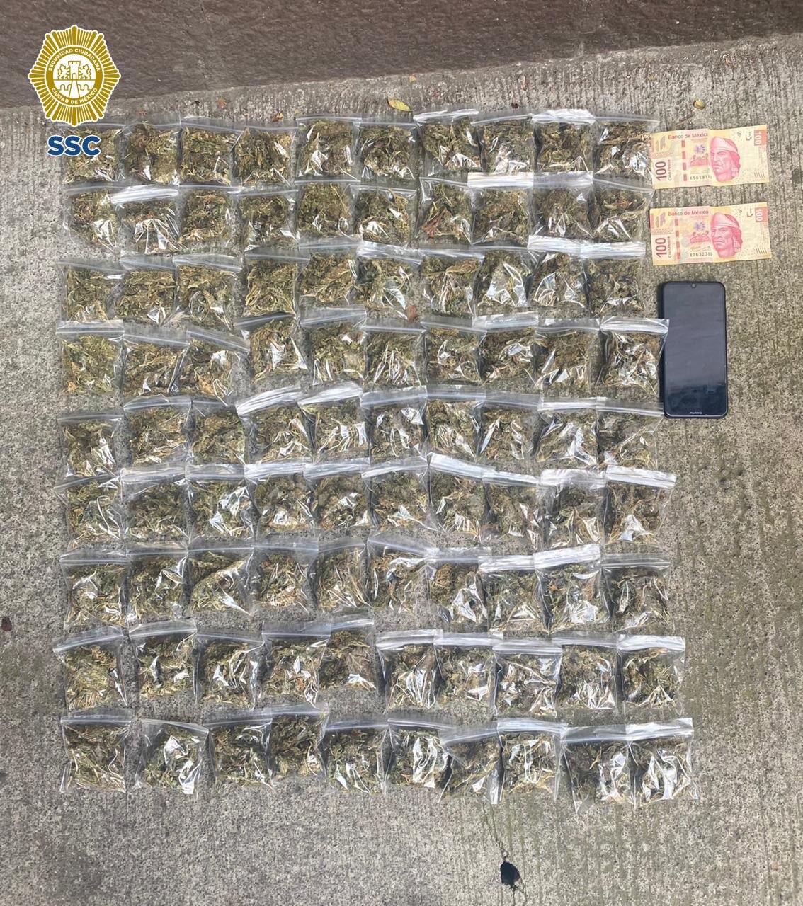 Derivado de lo anterior, se les aseguraron 90 bolsas de plástico transparente con una hierba verde y seca similar a la marihuana, dinero en efectivo y un teléfono celular.