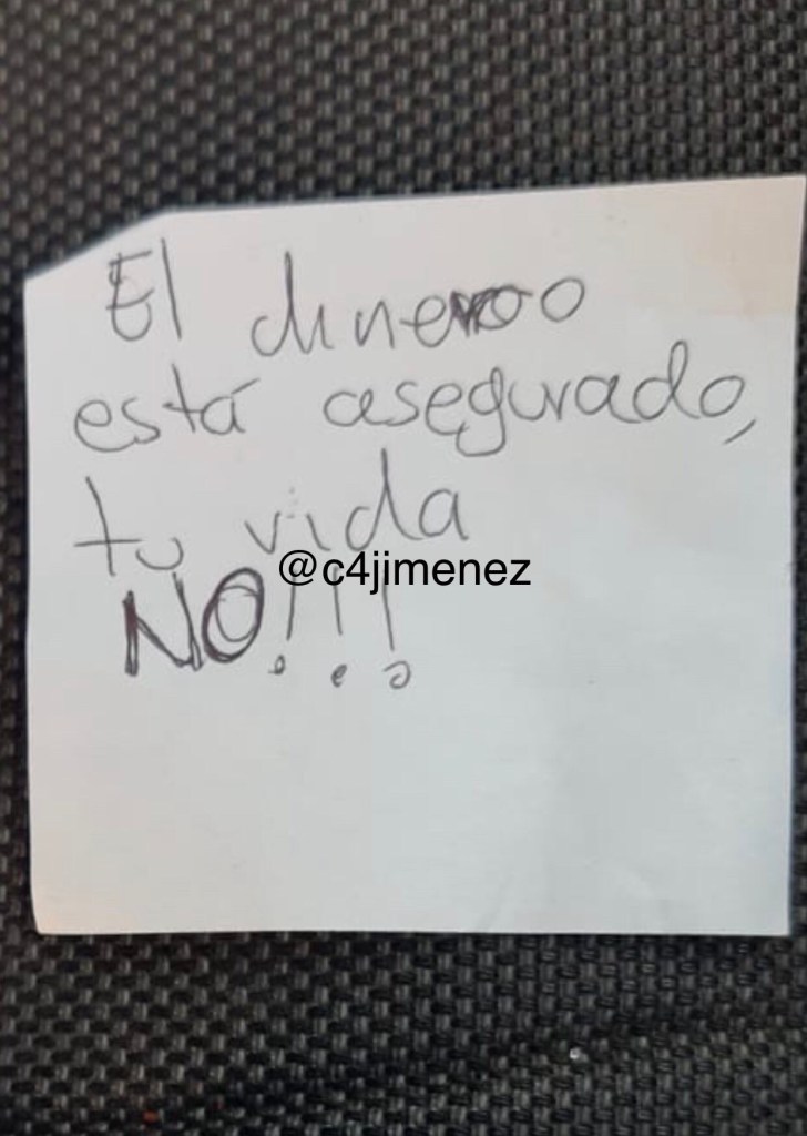 La cajera señaló a la mujer, como la persona que ingresó a las instalaciones y se dirigió a la caja número 1, donde entregó los mensajes y la amenazó con la supuesta arma de fuego, y al momento que notó la oportuna presencia de los uniformados se replegó en la pared.