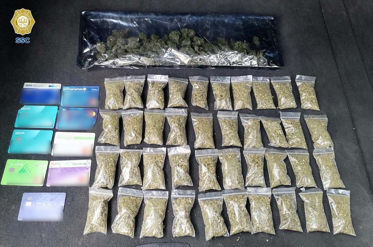 A los dos hombres se les aseguraron 40 bolsitas de plástico transparente y alrededor de 100 gramos de aparente marihuana a granel, además de nueve tarjetas bancarias emitidas por diferentes instituciones financieras, de las cuales no pudieron acreditar su posesión legal.