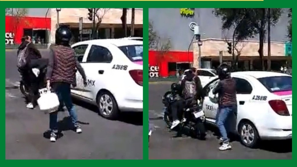 En las imágenes se observa la discusión entre el conductor de un taxi, un motociclista y su acompañante. Al parecer el taxista se le había cerrado a la moto, por lo que argumentaban que los iba a tirar.