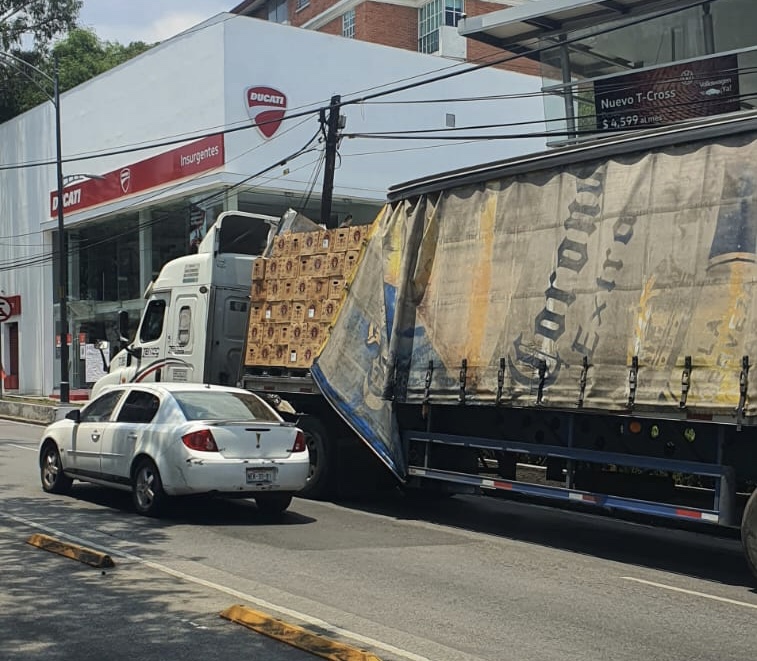 Un trailer que transportaba cerveza invadió el carril del Metrobús en la estación “Fuentes Brotantes “, cuando el conductor escuchó un golpe y ya no podía pasar. Al intentar salir de la estructura chocó contra otro vehículo.