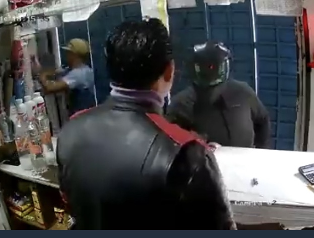 El periodista Antonio Nieto, difundió en Twitter las imágenes en donde se observa a un sujeto de casco negro, quien amenaza al trabajador con el pago de “derecho piso”, quien de no hacerlo le quemarían el local.