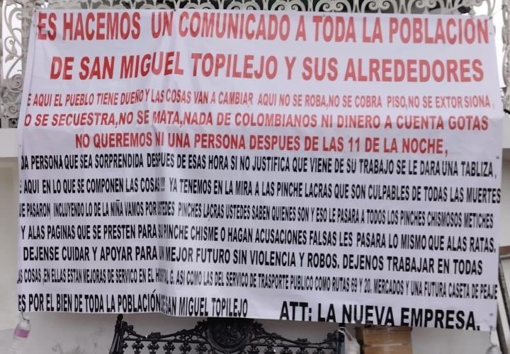 Efectivos de la Secretaría de Seguridad Ciudadana (SSC) de la Ciudad de México, el pasado 08 de octubre, tomaron conocimiento que en el Pueblo de San Miguel Topilejo, en la alcaldía Tlalpan, fueron colocadas tres mantas con distintos mensajes posiblemente firmados por una célula delictiva.