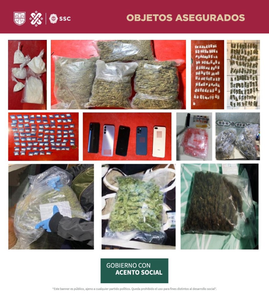 Resultado de trabajos de investigación de gabinete y campo, y del intercambio de información con el Centro Nacional de Inteligencia (CNI), efectivos de la Secretaría de Seguridad Ciudadana (SSC) de la Ciudad de México, con apoyo de personal de la Secretaría de la Defensa Nacional (SEDENA) y la Fiscalía General de Justicia (FGJ) capitalina, dieron cumplimiento a tres órdenes de cateo en las alcaldías Cuauhtémoc y Xochimilco, donde fueron detenidos tres mujeres y tres hombres, y asegurada aparente droga.