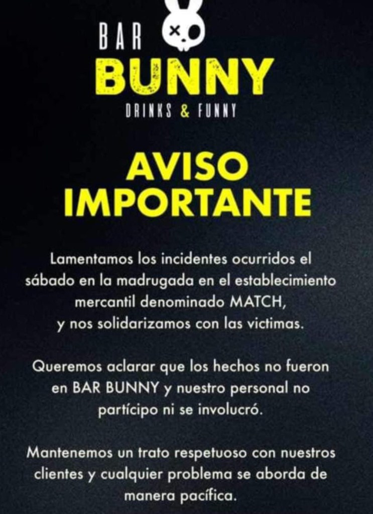 En respuesta a las acusaciones, la administración del bar Bunny emitió un comunicado negando la participación de sus empleados en el incidente. «Lamentamos los incidentes ocurridos el sábado en la madrugada en el establecimiento mercantil denominado MATCH, y nos solidarizamos con las víctimas. Queremos aclarar que los hechos no fueron en BAR BUNNY y nuestro personal no participó ni se involucró. Mantenemos un trato respetuoso con nuestros clientes y cualquier problema se aborda de manera pacífica».