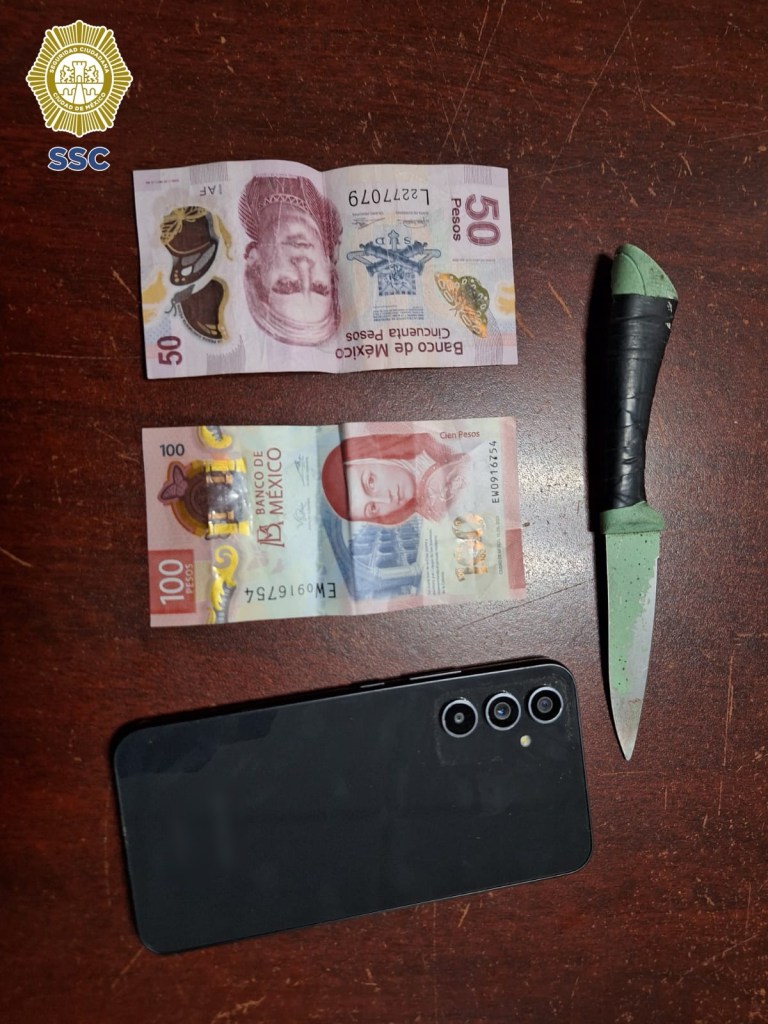 En el punto detuvieron al hombre de 42 años de edad, quien fue plenamente reconocido por el afectado, y enseguida conforme a los protocolos de actuación policial, le realizaron una revisión preventiva, tras la cual le hallaron un cuchillo de aproximadamente 15 centímetros de largo, así como un teléfono celular y dinero en efectivo, pertenencias que el denunciante reconoció como de su propiedad.