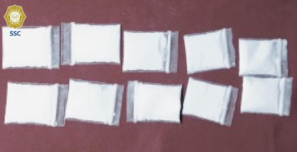 • Asegurado: 15 bolsas con sustancia similar a crystal, 10 bolsas con posible cocaína, identificaciones, teléfonos celulares y una tableta electrónica.