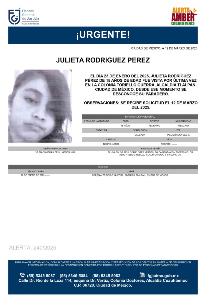 Ciudad de México, 12 de marzo de 2025 – La Fiscalía General de Justicia de la Ciudad de México activó la Alerta Amber para localizar a Julieta Rodríguez Pérez, una menor de 15 años de edad, y a su hija de 4 meses, quienes fueron vistas por última vez el pasado 23 de enero de 2025 en la colonia Toriello Guerra, alcaldía Tlalpan.