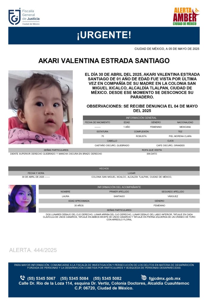 Ciudad de México, 5 de mayo de 2025 — La angustia crece en la alcaldía Tlalpan tras la desaparición de Akari Valentina Estrada Santiago, una bebé de tan solo un año de edad, quien fue vista por última vez el pasado 30 de abril de 2025 en compañía de su madre, en la colonia San Miguel Xicalco.