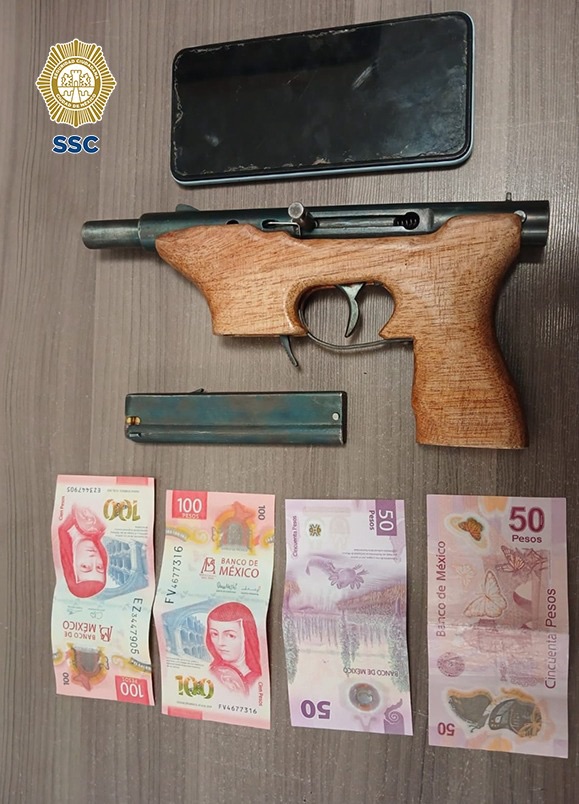 Durante una revisión preventiva, los policías aseguraron un arma de fuego corta tipo subametralladora, un cargador, dos cartuchos útiles, además de un teléfono celular y dinero en efectivo, objetos que fueron reconocidos por la víctima como de su propiedad.