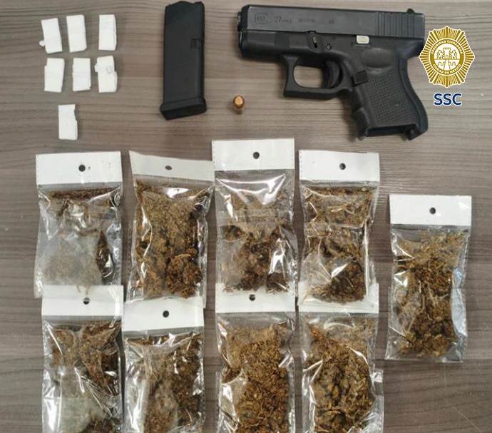 Al arribar al sitio, los policías les marcaron el alto y, conforme a los protocolos de actuación policial, realizaron una revisión preventiva. En el lugar fue asegurada un arma de fuego corta con un cargador abastecido con un cartucho útil, además de nueve bolsas con hierba verde seca con características de la marihuana, siete envoltorios con una sustancia en polvo similar a la cocaína y dinero en efectivo.